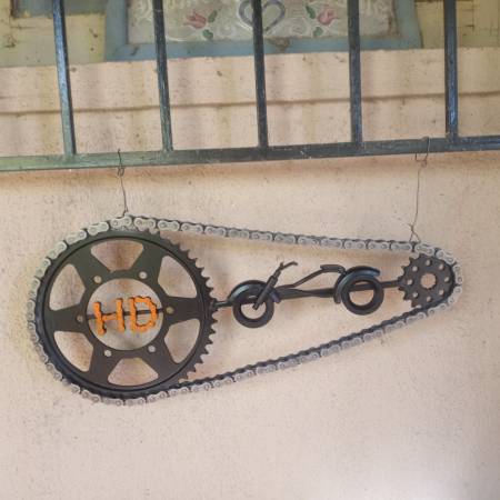 Gear Head Zia and Motor Cycle theme wall hanger. Items made from sprockets, chain and misc items.
