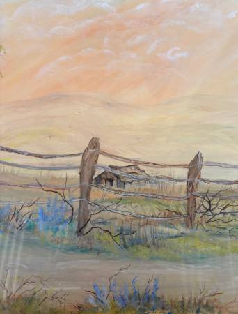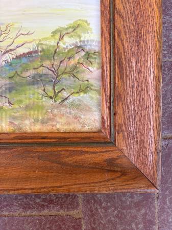 I want to say it is a watercolor, but I could be wrong. Artwork is behind glass. Makes it difficult to get a good photo. Photos show vertical lines, but they aren’t in the artwork-reflection of the corrugated metal roof.