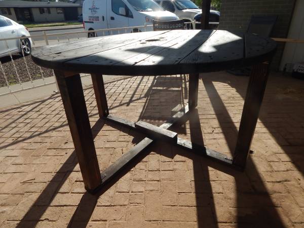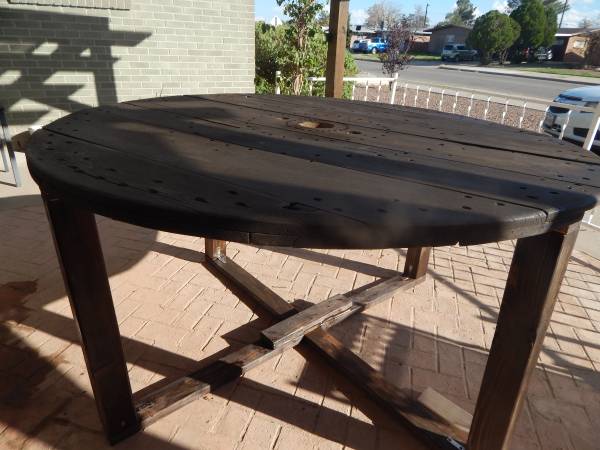 we have for sale a WOODEN SPOOL ROUND TABLE 64" DIAMETER WE JUST FINISHED DO THE TINT ON IT GOOD FOR A MENS CAVE OR BACK YARD EAST EL PASO