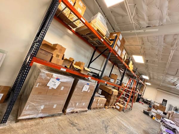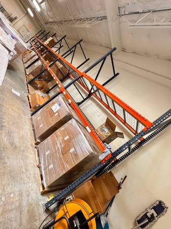 - INDUSTRIAL WAREHOUSE SHELVING. 2 RUNS OF 7 SECTIONS. 12FT HIGH 42IN DEEP 8FT LONG PER SECTION