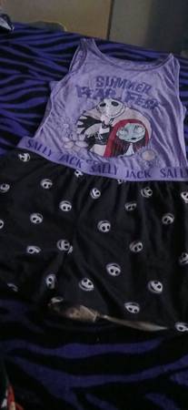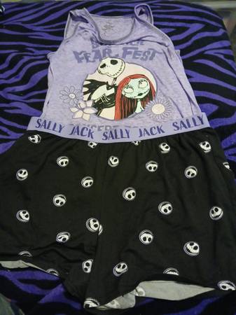 Women's 2 piece pajamas set shirt and shorts of the nightmare before Christmas jack and sally worn only 1 in great condition clean no holes or rips just selling it coz i don't wear it
