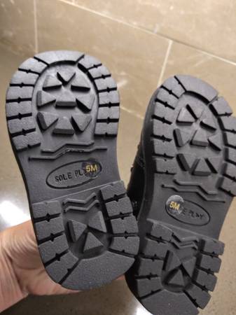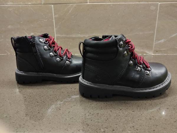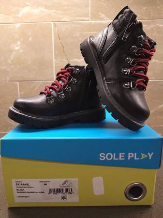 This is a NEW pair of Toddler Boy's Sole Play Aakil Lace up Ankle High Boots featured in black with red shoe laces. Have two (2) pairs available in sizes 5 and 8 and both are in NEW condition with original box with no stains, rips, cracks or damages. Located on the west side.