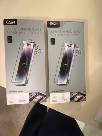 Two new sets of ESR Armorite Ultra-Tempered-Glass Screen Protectors. Includes 3 screen protectors, 2 lens protectors, alcohol wipe, dust stickers, and installation guide. Military-Grade protection and 110-lb force resistance. Designed for iPhone 15 Pro Max. About half of Amazons price.