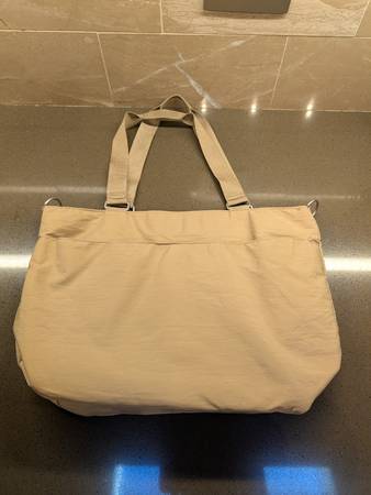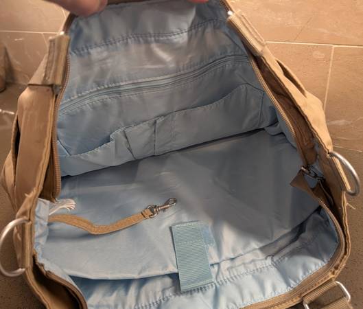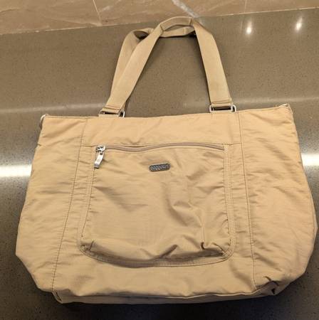 This is a Baggallini Laptop Tote Handbag featured in a tan exterior color with a pastel teal lining and silver hardware. With multiple compartments it's ideal for work and travel. Here are some of it's features: