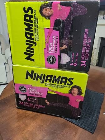 The product is 2 box sets of Ninjamas Girls Bedwetting Underwear in size Large . 68 pairs total in 2 boxes. Each box contains 34 pairs of underwear, providing comfort and protection during nighttime hours. The underwear comes in a colorful multi-colored design and is in a brief style, making it practical and stylish for young girls. Perfect for kids who struggle with bedwetting, this underwear offers a secure fit and reliable protection.