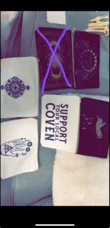 Witchy themed bags. Make up bags and wrist bags and/or book sleeve. $5 for makeup bags $10 for wrist bags Eastside pick up off of George dieter and montwood.