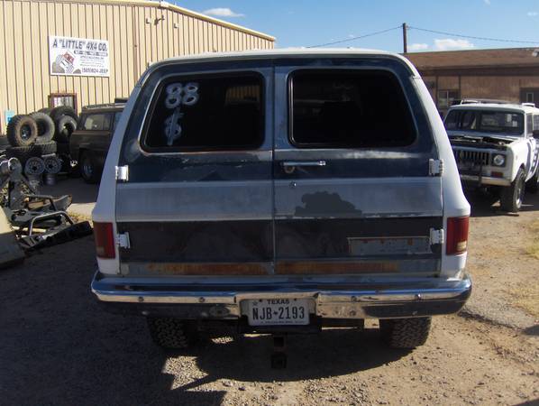 1988 Chevy, Chevrolet, Suburban with rear barn doors, 4 x 4, 350 engine rebuilt with 10,000 or less miles, RV cam, Holley alumn. intake and valve covers, Holley 650 CFM carb., MSD module/spark box, MSD coil, Headers, elelbrock air cleaner, 4 core alumn. radiator, P/s, P/b, 700R automatic transmission chrome pan rebuilt with 10,000 or less miles, NP 208 transfer case rebuilt with 10,000 or less miles, Regeared and rebuilt both axles 04/2021 with 4:88's, Detroit lockers, new install kits, front axle has new u-joints, chrome axle covers, Driveshafts have been rebuilt with new u-joints, 6 inch Rough Country lift kit with S.S. extended brake lines, 35 x 12.5 x 15 BFG All Terrian tires 2 years old, 15 x 10 American racing alumn. rims, front seat have been reupholstered, back seat original, No third seat, 2 in tow hitch. Invested more that $25,000 in this vehicle.