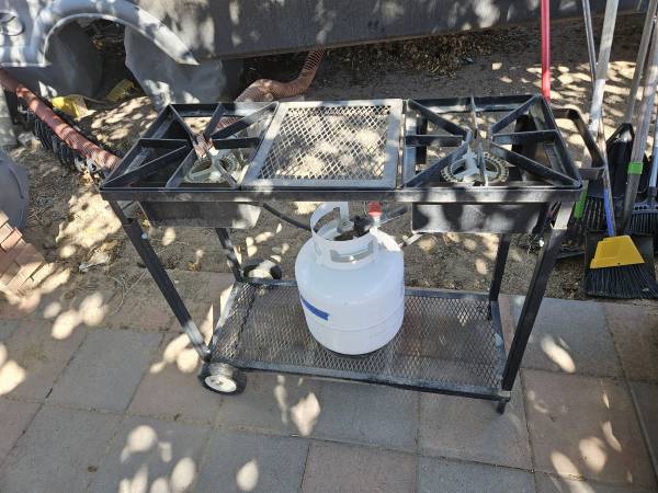 2 BURNER STOVE 2 LARGE POTS 1 20lbs PROPANE TANK
