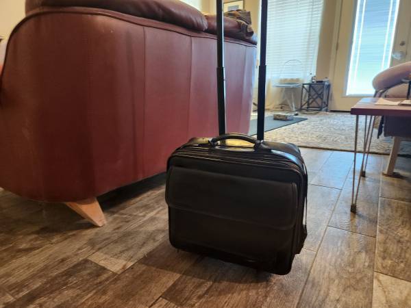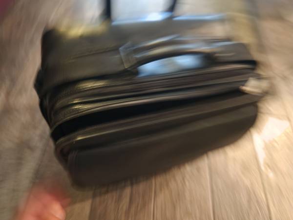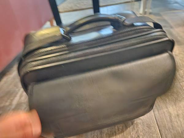 Black Leather luggage used for travel with laptop or clothes. Comes with 3 main pockets and two small pockets. Great for travel. Great condition.