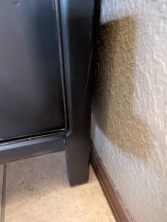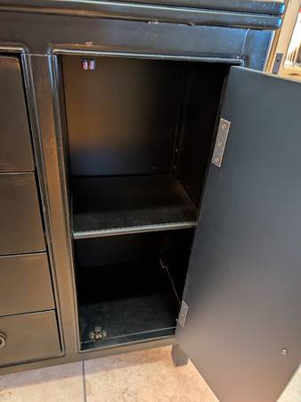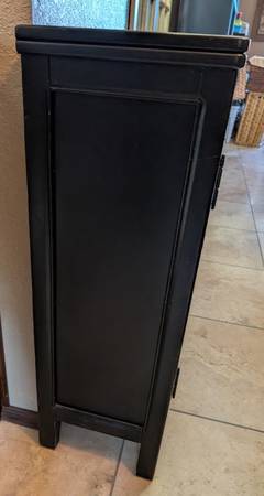 This is an Asian Oriental Entry Table in a distressed black finish that would fit perfectly as an accent piece to an entry or hallway due to it's slim dimensions. Its hand-applied distressed black finish creates a captivating focal point, revealing subtle hints of the wood underneath that adds depth and character. It features burnt brass-finished hardware, including simple ring pulls on the center drawers and two side cabinets. With ample storage space, this console is both a functional and beautiful addition to any room. It measures approximately 3 ft. tall x 30" wide x 12" deep. It's in EXCELLENT condition except that the first drawer has a stain inside (please see pic), all other drawers are in perfect condition. It also has a slight crack on the back leg that has been repaired but is noticeable (please see pic), however it does not affect it's sturdiness or compromise it in any way, it's just cosmetic. Located on the west side.