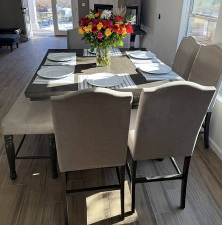 Dining Table with 6 Chairs + 1 Bench Text to English/Espanol