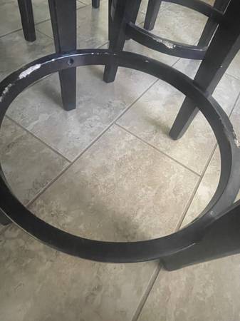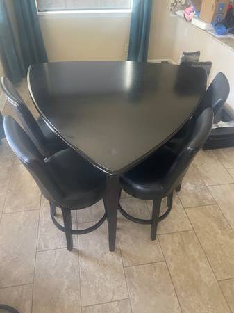 Dining table 6 seater. Dark wood. Has some damage to the bench and bottom of chairs as shown in pics.