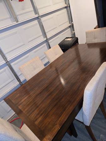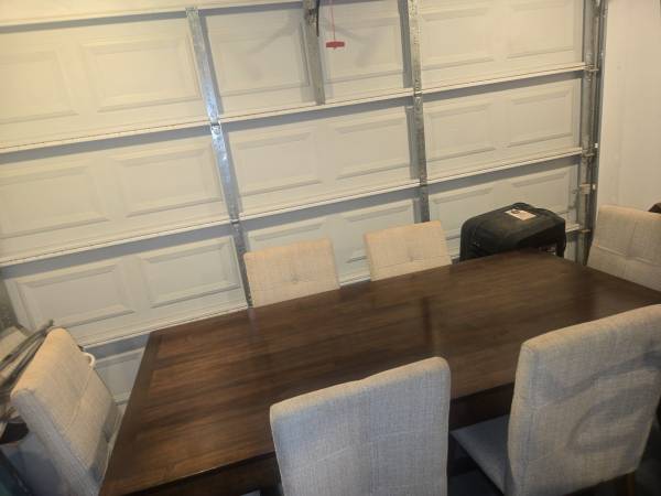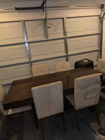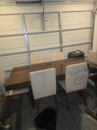 Good condition dinning room set, and 6 chairs, transitional to modern, table brown chairs beige upholstery, phone #