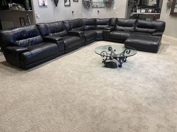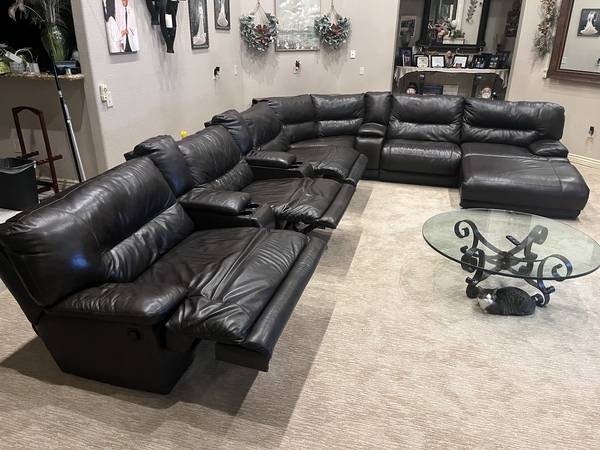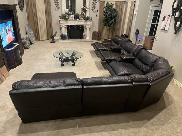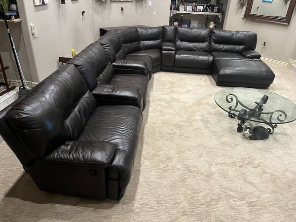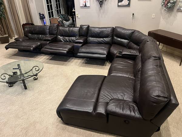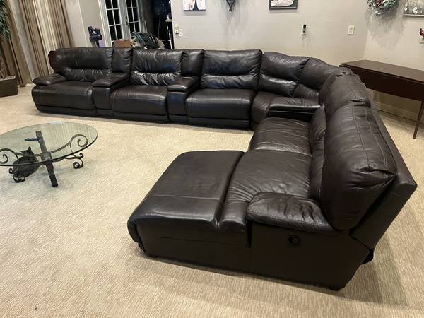 Large Ashley's sectional sofa with three recliners and one comfortable lounger that can recline. Brown leather in good condition. Cash Only Transaction