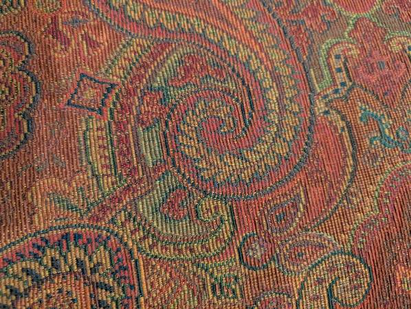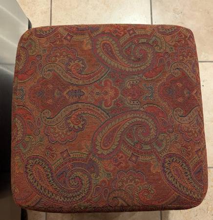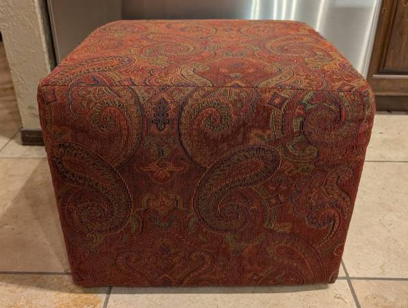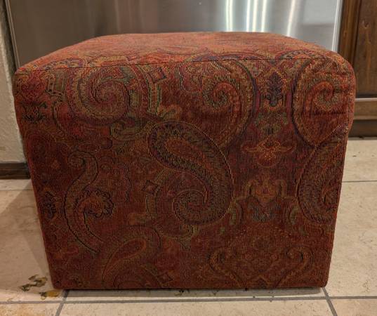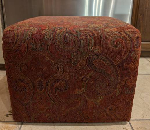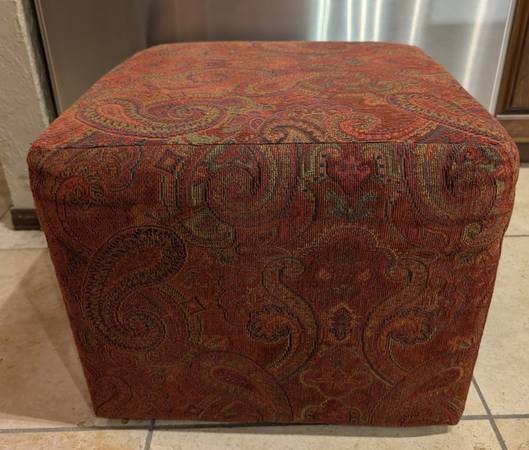 This is a beautiful colorful square ottoman / footstool that would be a great addition to any room. Use it when you need to put your feet up or as extra seating. With it's thick tapestry of deep maroons, browns, neutral earth colors it will blend in with any decor. It measures approximately 22" tall x 22" wide x 16" tall and is in EXCELLENT condition with no stains, cracks or damages. Located on the west side.