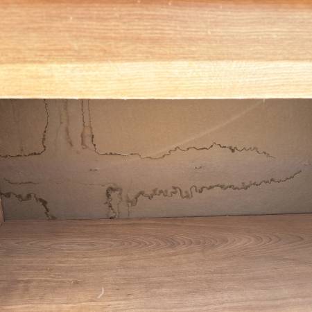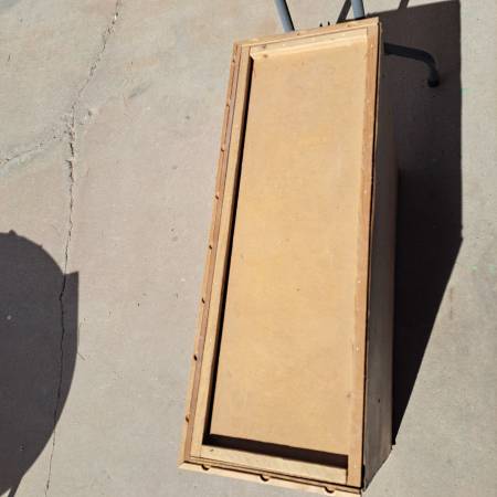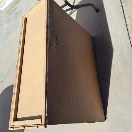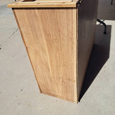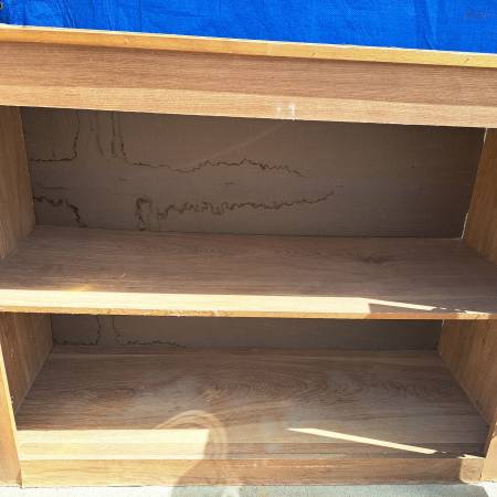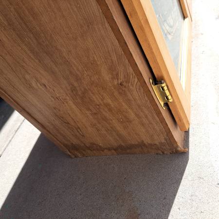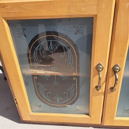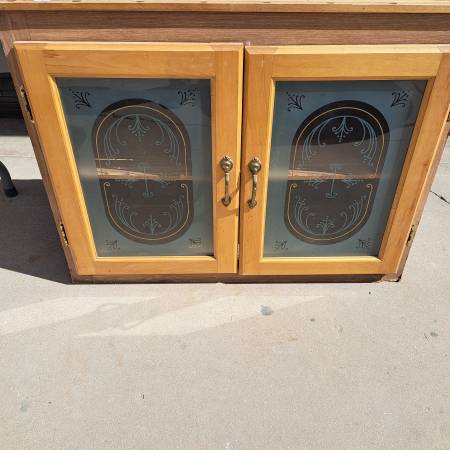 Wood cabinet with glass doors. Approximately 33x25x12 inches. Some water marks on back. See pics.