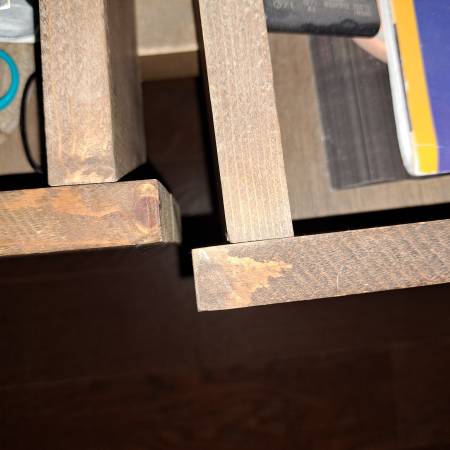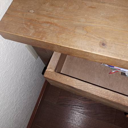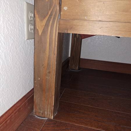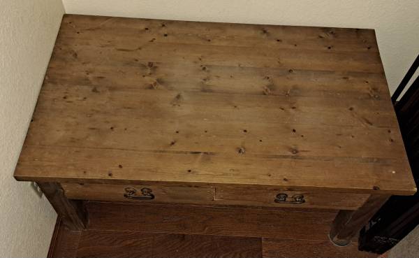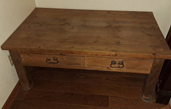 Solid wood coffee table. Made in Mexico in 1999. 49 inches x 28 3/4 inches. 20 inches tall. Four solid wood drawers, two on each side. One leg has small amount of pet chewing, see pics.