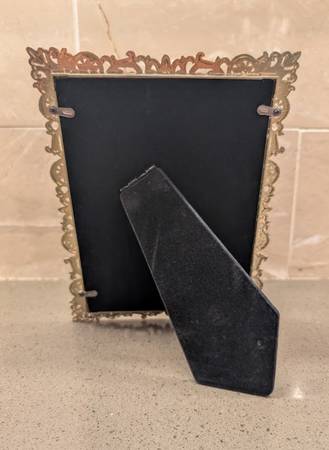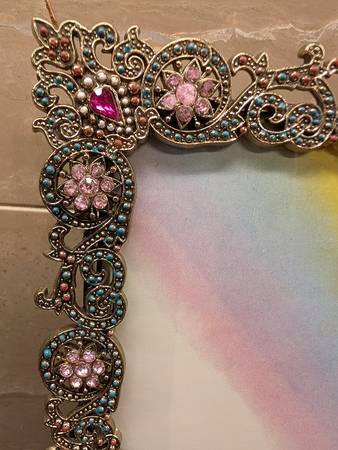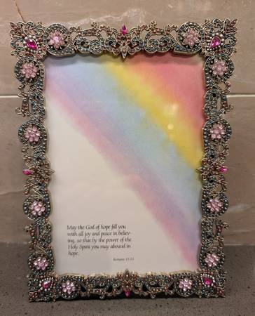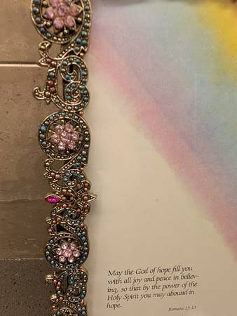 This is a beautiful jeweled frame that features a Bible scripture with a rainbow background. It features multiple jewels on the bronze frame that is stunning. It also has a black velvet backing and measures approximately 8.25" tall x 6.25" wide and is in EXCELLENT-NEW condition with no stains, chips, cracks, dents or damages. Located on the west side.