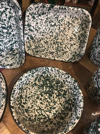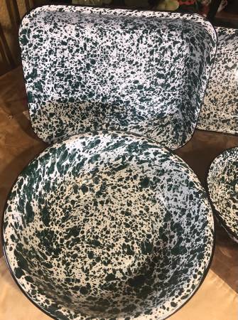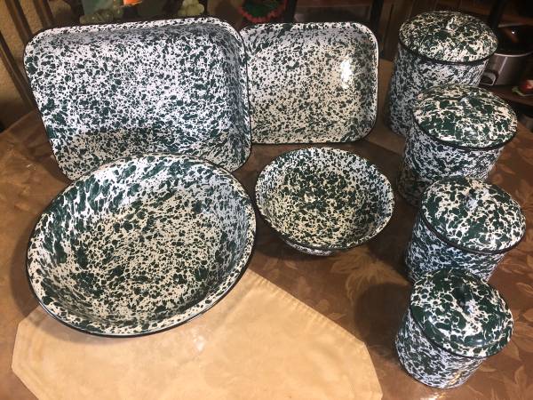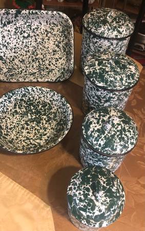 12 piece Cgs International green fine enamelware 2 bows, 2 trays and 4 piece canister set with lids in next to new condition $80 for all firm.