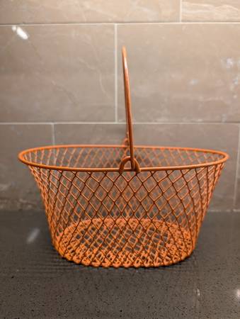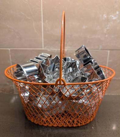This is a NEW Fall Basket with NEW Fall Cookie Cutters. The basket is made of wire and it's handle is movable and measures approximately 9.5" wide x 8" deep x 5" tall. There's a total of 14 metal cookie cutters that includes: