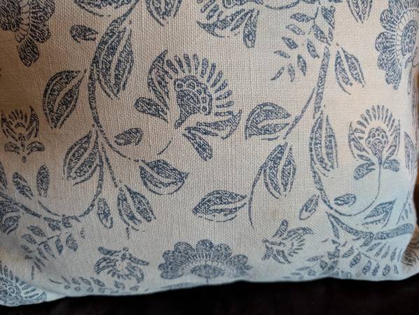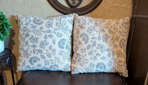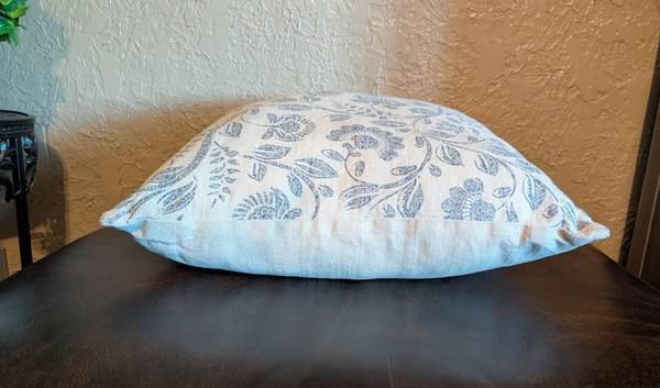 Add timeless, casual elegance to your living room or sitting space with this Cotton Square Throw Pillow from Threshold™. This double-sided throw pillow is decorated on the front with blue flowers and stems on a solid background to complement farmhouse, cottage or coastal aesthetics. Featuring a zippered cotton-linen shell with a soft polyester filling pillow. It measures 18" x 18" and is in EXCELLENT-NEW condition with no stains, rips or damages. Have two (2) available, each are $9 or both for $15. Located on the west side.