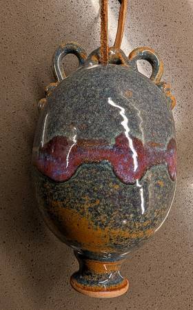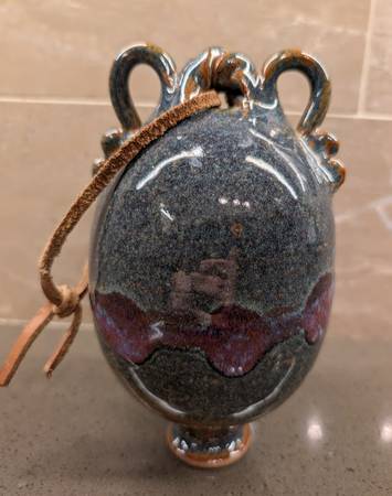 This is Ceramic piece has a canteen round design and an elongated mouth with a triple handle design on a leather strap. It features deep blues, maroons and browns throughout with a glossy finish. It measures approximately 7.5" tall x 4" diameter and is in EXCELLENT condition with no stains, cracks, chips or damages. Located on the west side.