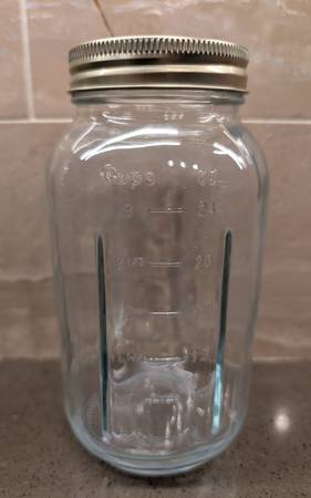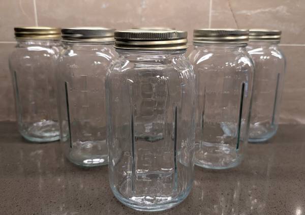 This is a set of six (6) Regular mouth Mason 32 oz. canning jars with rings. Perfect for canning and you could also use them as drinking glasses. They are in EXCELLENT condition with no chips,...