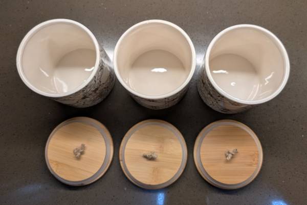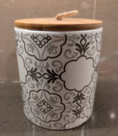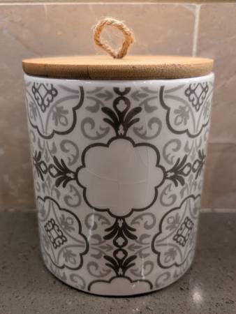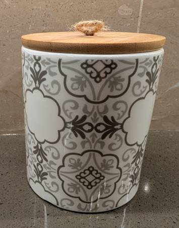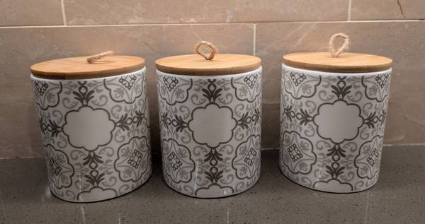 * Ceramic jars feature a white background with gray / taupe design.