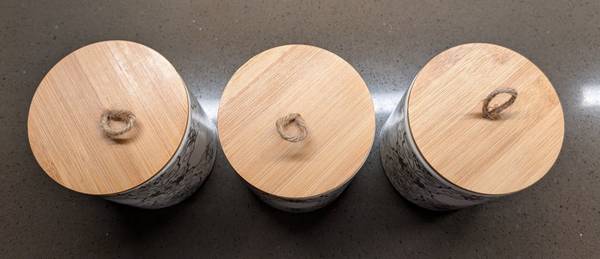This is a set of three (3) NEW Ceramic Jars / Canisters with Bamboo Wood Airtight Lids that would look great in any kitchen or coffee bar area. Here are some of its features: