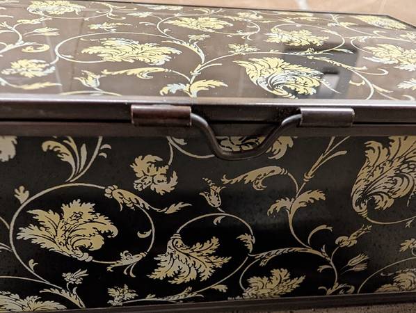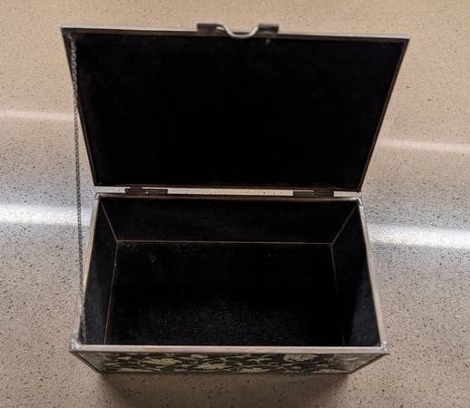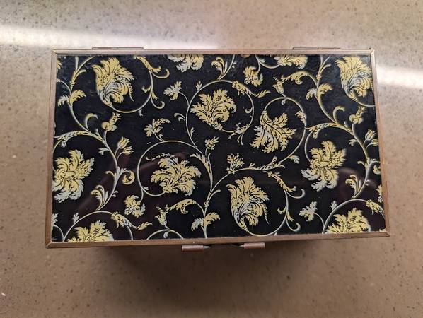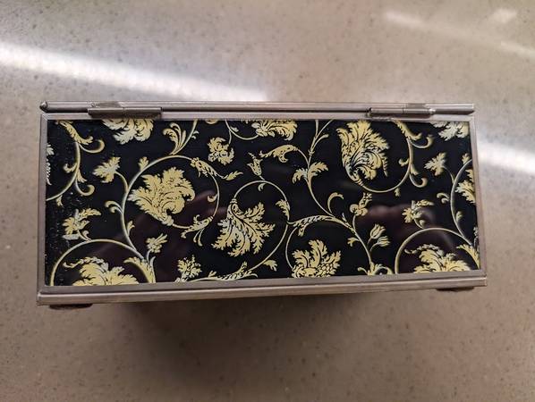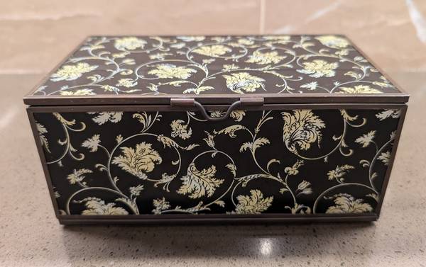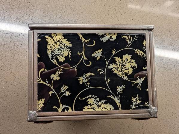 This is a beautiful Stained Glass Trinket Box that is a perfect addition to a dresser to hold jewelry or place it on your desk to store supplies. It features a hinged metal frame with black background with stained pastel yellow and gray vines. It's fully lined inside with a black velvet material and measures approximately 6.75" wide x 3" tall x 4" deep and is in EXCELLENT-NEW condition with no stains, cracks, chips or damages. Located on the west side.