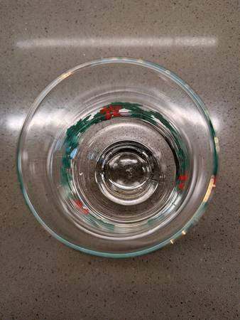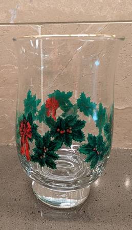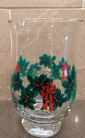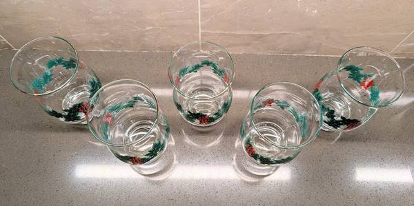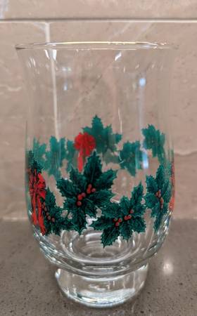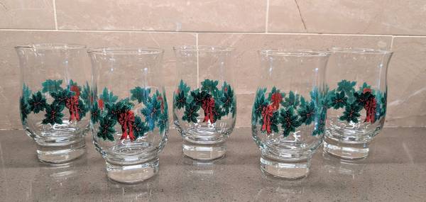 This is a Vintage set of five (5) Libbey LRD19 Holly Berry and Ribbon Set of drinking glasses. This 12 oz. Hurricane Flat Footed Tumbler features a garland of green holly with red berries, ribbon and bows on a clear glass background. It has a 22k gold decorated rim and would certainly add a festive touch to your setting. Each one stands 5.25" tall and have a 3" diameter. They are in EXCELLENT condition with no stains, chips, cracks or damages. Located on the west side.
