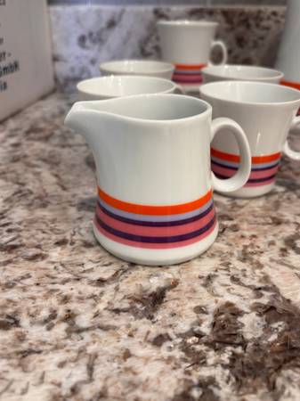 This mid-century modern set features bold retro striping in orange, pink, and purple with matching circular lid detailing — a perfect statement piece for collectors or anyone who loves clean European design.