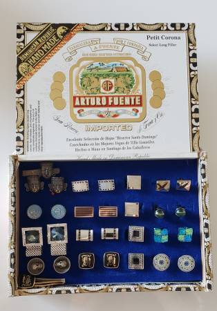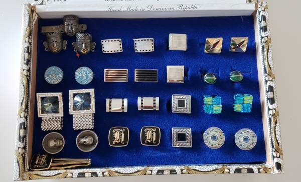 Cufflink collection in display box. No gold or sterling. Includes adapters for non-French cuff shirts. OBO.
