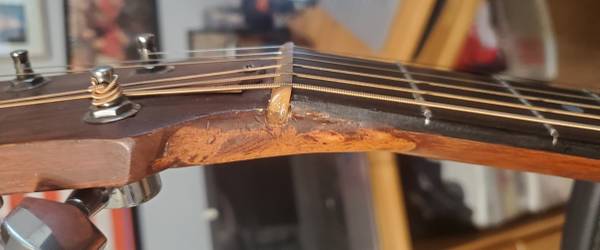 Neck / Nut area has been professionally repaired – repair isn’t pretty but is very solid, action is low, truss rod functions perfectly