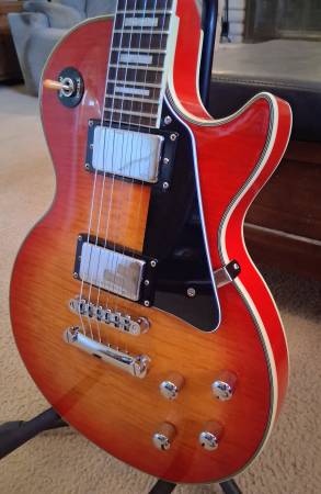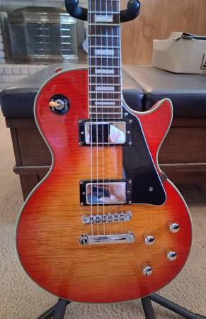 2001 Epiphone Les Paul flame top in excellent condition. Upgraded with EMG metalworks 80/61, has a new bridge, pickguard, a graph tech nut and hip shot locking tuners. The back of the neck is a smooth satin finish. Action is comfortable and low. Open to trades for other guitars.