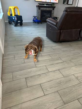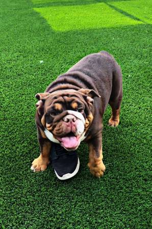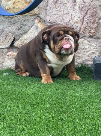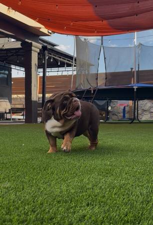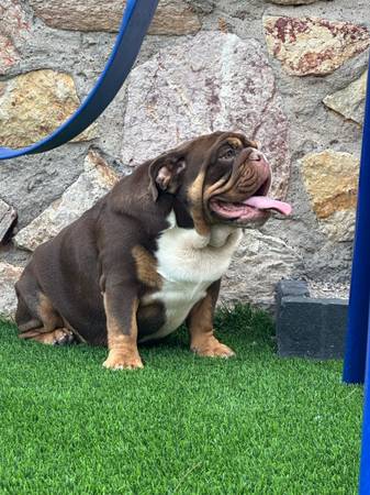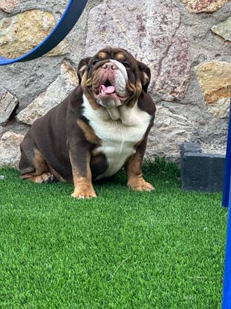 Honey is a sweet chocolate tri English bulldog female born on December of 2024 has microchip she is up to date on ALL VACCINES and is also dewormed text only show contact info