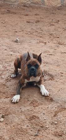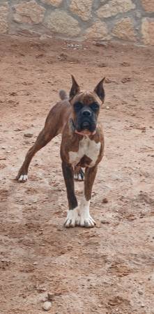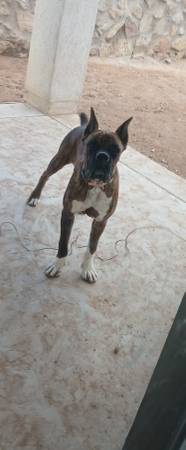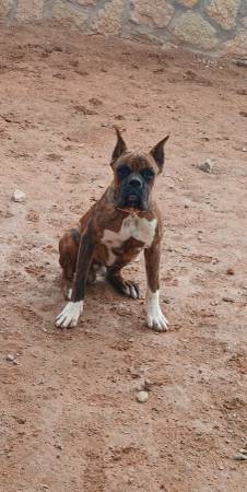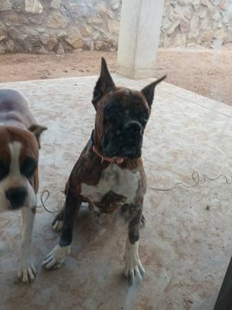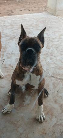 Brindle Boxer male Puppy 8 months Shots and deworming up to date Akc registered Text for more info Serious inquiries only please Must rehome make offer