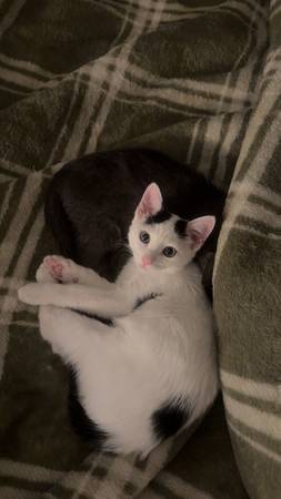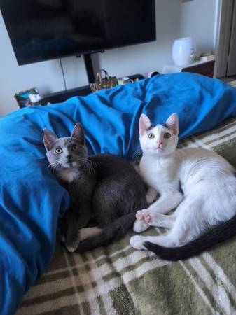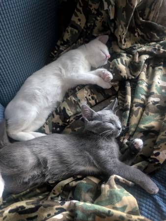 I have two kittens approximately 2 1/2 months old looking for a good home. We found them on the street when they were abandoned by mom. Unfortunately my partner is deathly allergic and we are both in the military and cannot keep them. They are both litter-trained, microchipped, and have their first round of shots. They are very curious, love to play with toys and keep one another very entertained. We named the white one Daisy and the grey is Lily. They love people and are friendly to strangers. Lily will meow sometimes and Daisy is very quiet. Both like petting and love taking a nap in your lap or beside you.