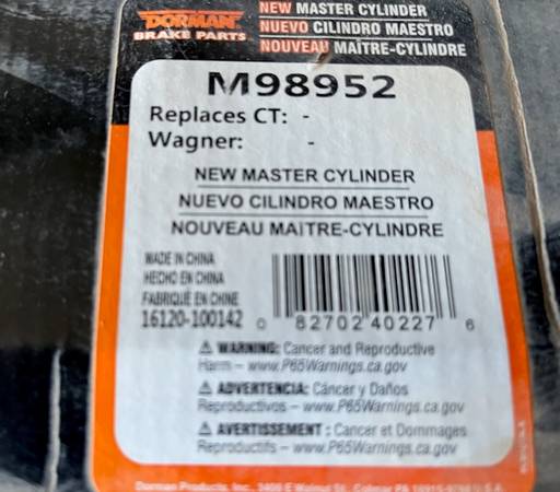 This is a new in the box Dorman Master Cylinder M98952. This is for Chevrolet and GMC trucks and Suburbans with manual brakes. Find at Autozone or Napa for 75 plus tax.