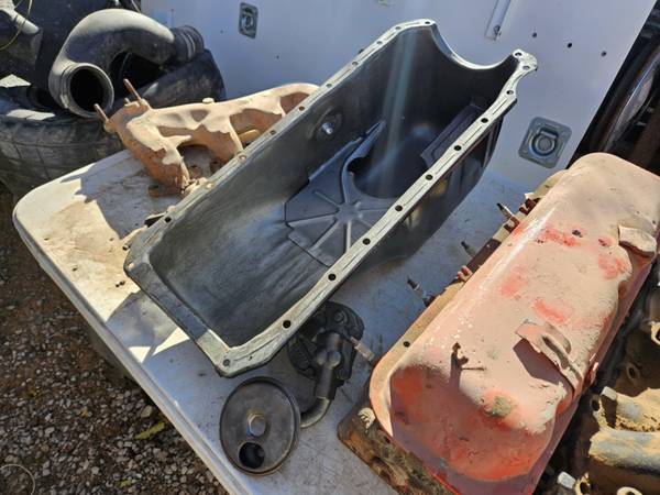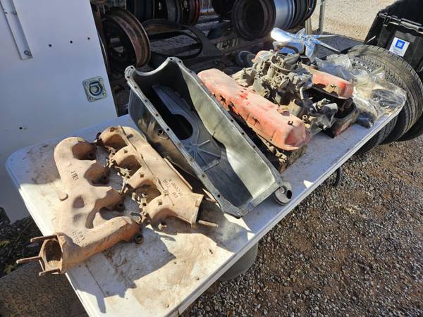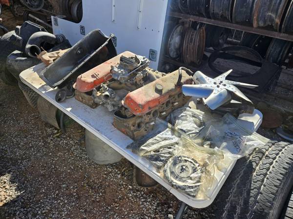 Up for sale are several miscellaneous Chevy Big Block parts. Included are a pair of cylinder heads, 2 valve covers, an Intake manifold, Holley carburetor, oil pan, oil pump, water pump, cooling fan, and timing gear. The price is $300.00 for everything. Call: show contact info