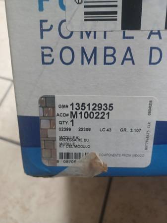 New GM fuel pump for tank part #13 51 29 35, New genuine GM part in box. Pump and seal only, no fuel level sensor. Fits 2015 to 2016 Chevrolet Suburban, GMC Yukon XL and Cadillac Escalade ESV with...