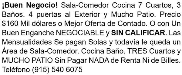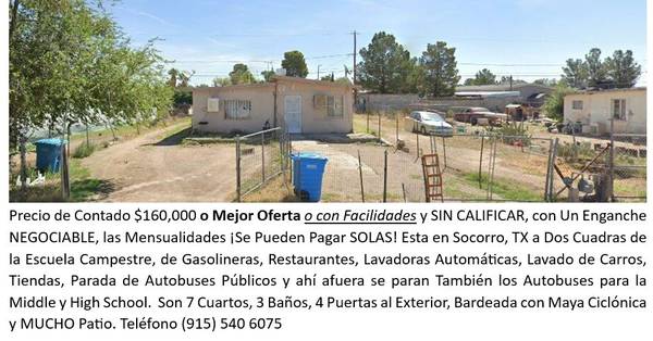 $160 Mil o Mejor Oferta de Contado. Casa 7 Cuartos, 3 Baños y Mucho Patio. Está por la Escuela Campestre de la Calle Passmore en Socorro, Zona Bonita, Tranquila y Segura, tiene Todo Cerquita como: Lavadoras, Gasolineras, Lavado de Carros, Tiendas Restaurantes, Refaccionarias, Autobuses y Todo lo que pueda necesitar y los Autobuses Escolares se para ahí a Contra esquina ¿Qué más Puede Pedir? ¡Aproveche esta Oportunidad! Teléfono show contact info