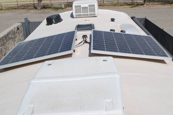 a Solar Flex 400i package includes a solar inverter, two roof panels for solar charging and sidewall port access for portable solar panel systems.