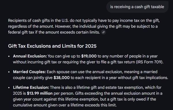 The COOL part here is that giving OR receiving a monetary gift IS NOT TAXABLE income. You kept it all (See attached pic above) I Googled it for you. ;-)