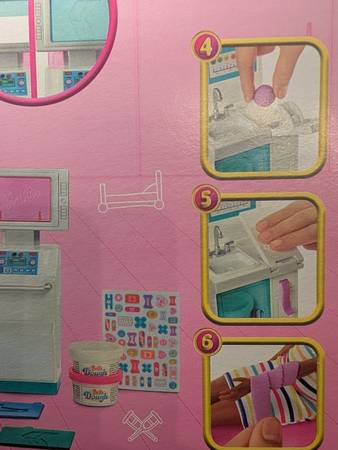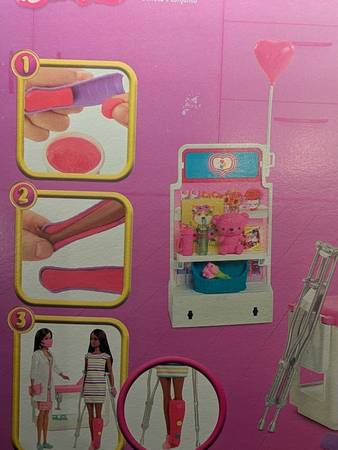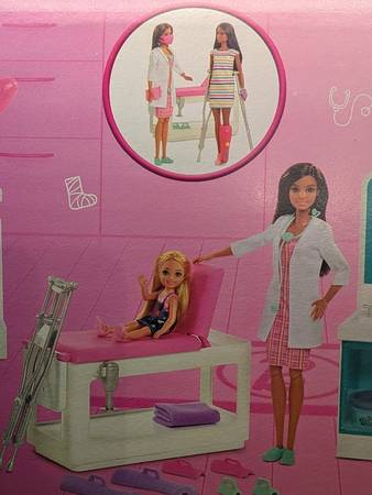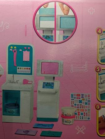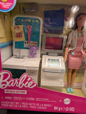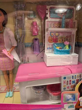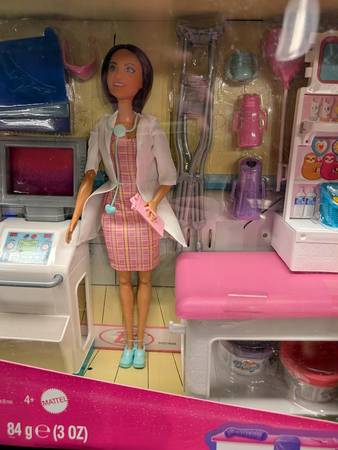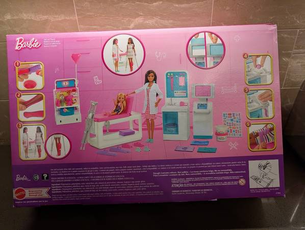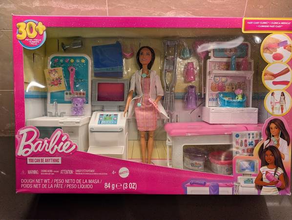This is a NEW Barbie Careers Fast Cast Clinic Playset. Your little one will explore a world of taking care of others with the Barbie Fast Cast Clinic playset! Barbie is wearing a cute plaid dress, white doctor's coat and sporting a stethoscope and clipboard. She can prepare at her medical station, take X-rays and check patients on the exam table. When she determines a patient has a broken arm or leg, she can make a pink, purple or white cast with the dough and cast-making accessories! There are also stickers to decorate the patient's cast. Barbie doctor doll can also use dough in the bandage-making station to create a wrap for her patient injuries as well! When it's time for a break, visit the colorful gift shop to get a gift or snack! It's in NEW condition with the original packaging box. Located on the west side.