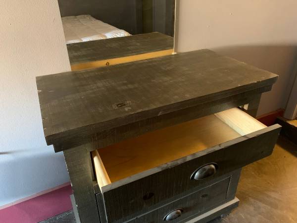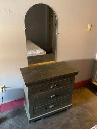 Three drawer dresser and wall mirror for sale. Buy separately or both for less. Dresser: 32"W X 32"H X 16"D Mirror: 20"W X 60"H Thank you.
