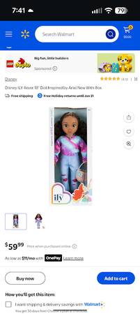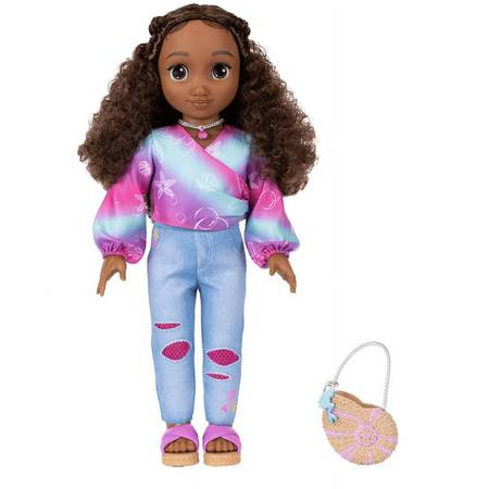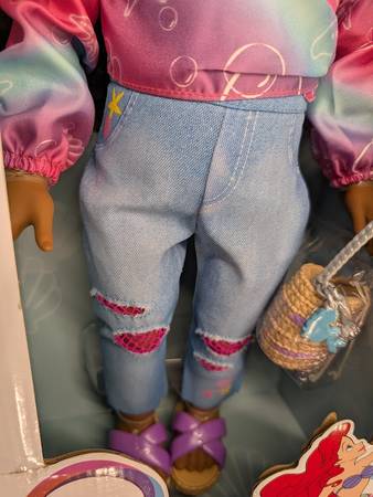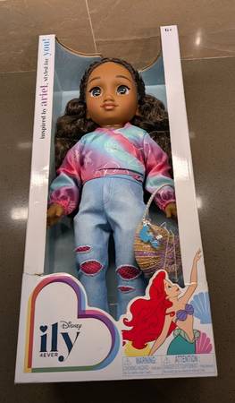This is a Disney ily 4EVER 18-inch doll, inspired by the beloved Disney favorite Disney character, Ariel. This doll has curly brown hair and big brown eyes and is ready for a seaside stroll. Her shimmery, iridescent blouse, jeans with "fish net" patches, and criss-cross sandals make the perfect outfit for a girl on the go. Never far from her love of the sea, she wears a scallop necklace and carries a shell-shaped handbag to hold all her thingamabobs, including her mermaid-shaped keychain. She's in NEW condition with original box and located on the west side.