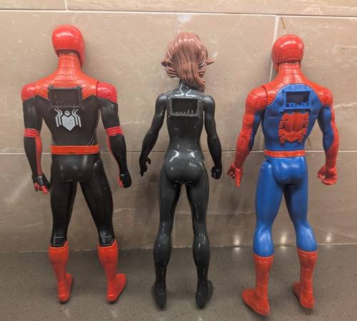 This is a Hasbro Marvel Spiderman Titan Heroes Series that includes two (2) Spider-Man and Spider-Girl. These 12" Action Figures can be connected to a projectile launcher (not included) to port on Spider-Man action figure’s back to activate sounds and phrases inspired by the Spider-Man Movie and fire projectiles! They are all in EXCELLENT condition with no stains, cracks, chips or damages. Located on the west side.