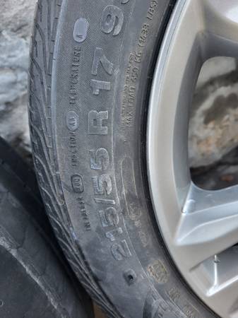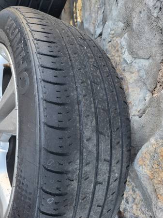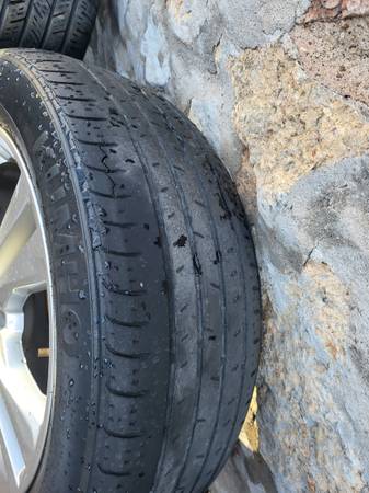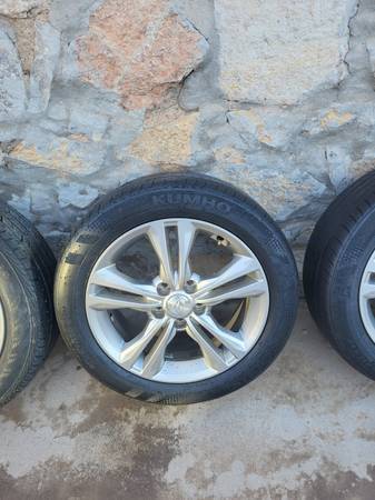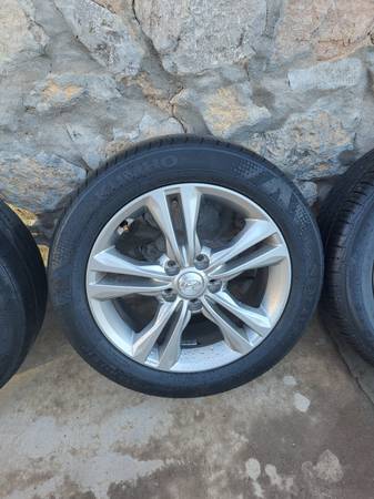 set of 4 oem rims and tires for hyundai vehicles or any other like nissan, honda, toyota, lexus, infiniti, etc. These rims are literally like new. 2 tires are really good, 2 hold air. tire size is 215/55/17. rim wheel bolt pattern is 5x144.3 same as 5x4.5. Thank you for looking and God Bless. $ 450 obo.