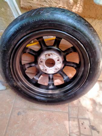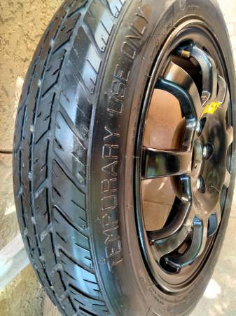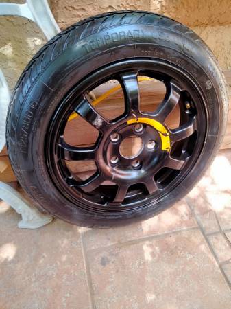 Please text! 9one5 two76 43 fourfour 5x4.5 on the lugs...wheel is aluminum...Hyundai brand, but fits any with this lug pattern. Little to no use on it. Always be ready..especially long road trips....
